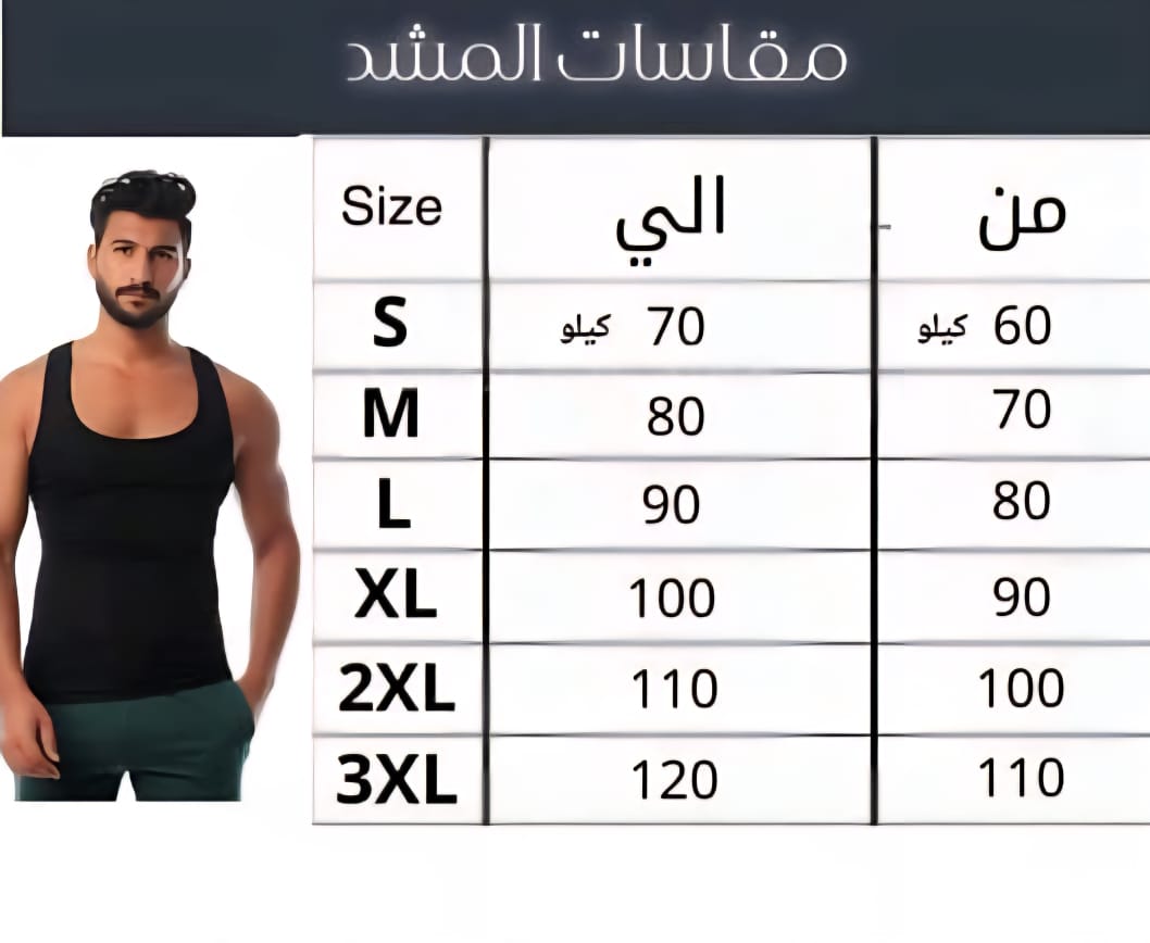المشد متوفر بمقاسات متعددة بتبدأ من **XL لحد 4XL**، ومناسب حتى وزن **120 كيلو تقريبًا**.